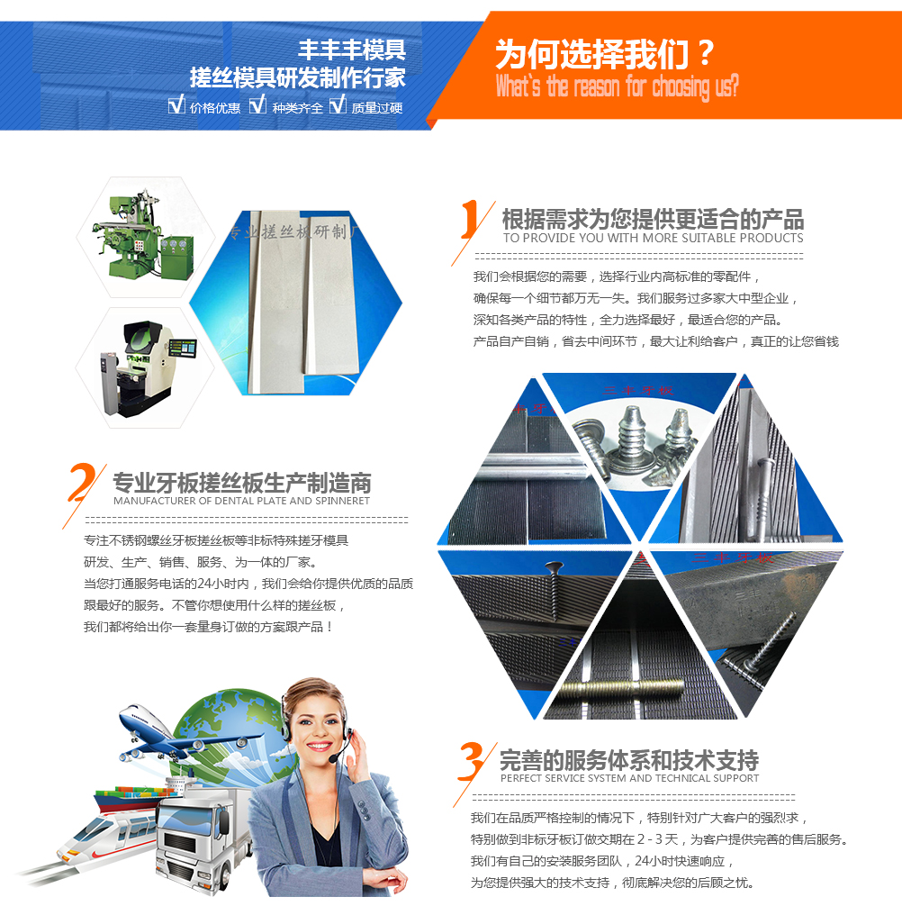 我們始終抱持著勤、誠(chéng)、信的原則,致力于螺絲牙板、搓絲板產(chǎn)品專業(yè)廠商。多年來(lái),由于全體同仁的勤奮、誠(chéng)樸與使用客戶的支持與信任。造就三豐牙板品牌在業(yè)界樹(shù)立的良好形象,也建立了品質(zhì)保證的優(yōu)良信譽(yù)。勤、誠(chéng)、信是三豐牙板全體同仁共同遵循的中心理念,更是我們服務(wù)客戶的宗旨。主營(yíng)產(chǎn)品:不銹鋼搓絲板,不銹鋼機(jī)絲倒角切平牙板,D/W雙線單出(ss)墻用細(xì)牙搓絲板,機(jī)絲束桿圓尾牙板,機(jī)絲帶圈位螺絲牙板,高低牙自攻牙板,機(jī)絲帶溝五溝牙板,不銹鋼扭花紋搓絲板,牛仔釘牙板,直齒搓花板等搓絲模具。產(chǎn)品可滿足國(guó)標(biāo)(GB)、德標(biāo)(DIN)、美標(biāo)(ANSI)、日標(biāo)(JIS)、國(guó)際標(biāo)準(zhǔn)(ISO)等各種國(guó)際通用標(biāo)準(zhǔn),并能根據(jù)客戶實(shí)際要求,設(shè)計(jì)訂做各種特殊非標(biāo)規(guī)格...